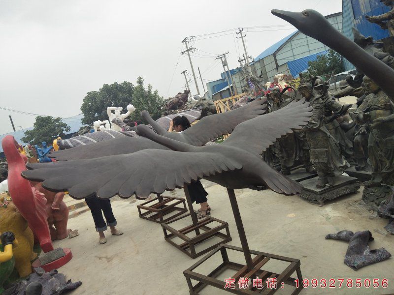 铜雕动物产品不像木雕动物,可以四脚凌空不留底,除一些很小的雕刻件外,一般都脚下连底。这主要是材料因素使然,石头性脆,连底雕刻四肢才相对牢固。某些身躯肥大、四肢比例又较为高且细的动物,如牛、马、鹿,腹下完全凌空会有折断的危险,还要在腹下、脚边雕些高起的岩石草木等景物连带加固。这也就自然产生了配景,使这部分本来是为了加固的物体,成为增加趣味性和装饰性的有机体,并不使人感到多余,而是使动物活动环境化,更活泼有生气,有的还可取点色,多施点技巧,使产品粗中有细,更耐看。
