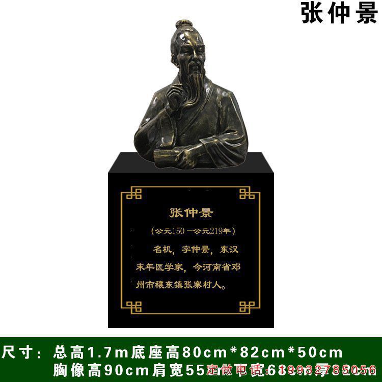 张仲景雕塑是一尊雕塑,代表着中国传统医学的伟大开拓者,革新家张仲景。张仲景(150-219),字景贵,晋襄阳(今河南省南阳市)人,史称景博士或术士景,是两汉末三国之际专门从事医学研究、诊疗实践,写出传世著作《黄帝内经》《伤寒论》等医学名著的先祖。所以,为了纪念张仲景医学的历史贡献,他的雕像被建立在中国众多名医雕像中,以示对医学大师的爱戴和尊重。雕塑立立于上海华东医院大门西侧。雕像以大理石材质铸就,它表现了张仲景威严的外表形象,手执玉玺和书籍,有“传世之大师”的美誉。张仲景雕像的安落,意在向后世传播中国传统文化。张仲景作为他所涉及的学科开拓者,他用勤奋奉献的精来传承传统医学,他是科学发展的坚强后盾和中华民族进步道路的稳固力量。